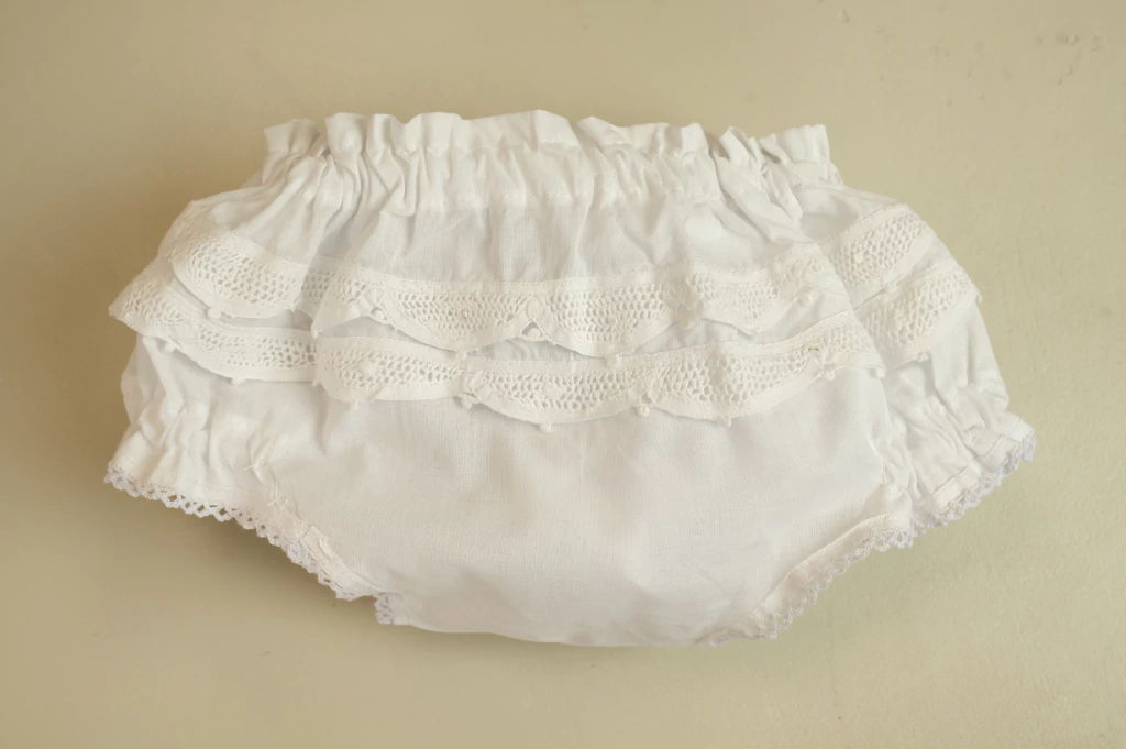 Cute and elegant 100% cotton bloomers with renaissance lace ruffles.